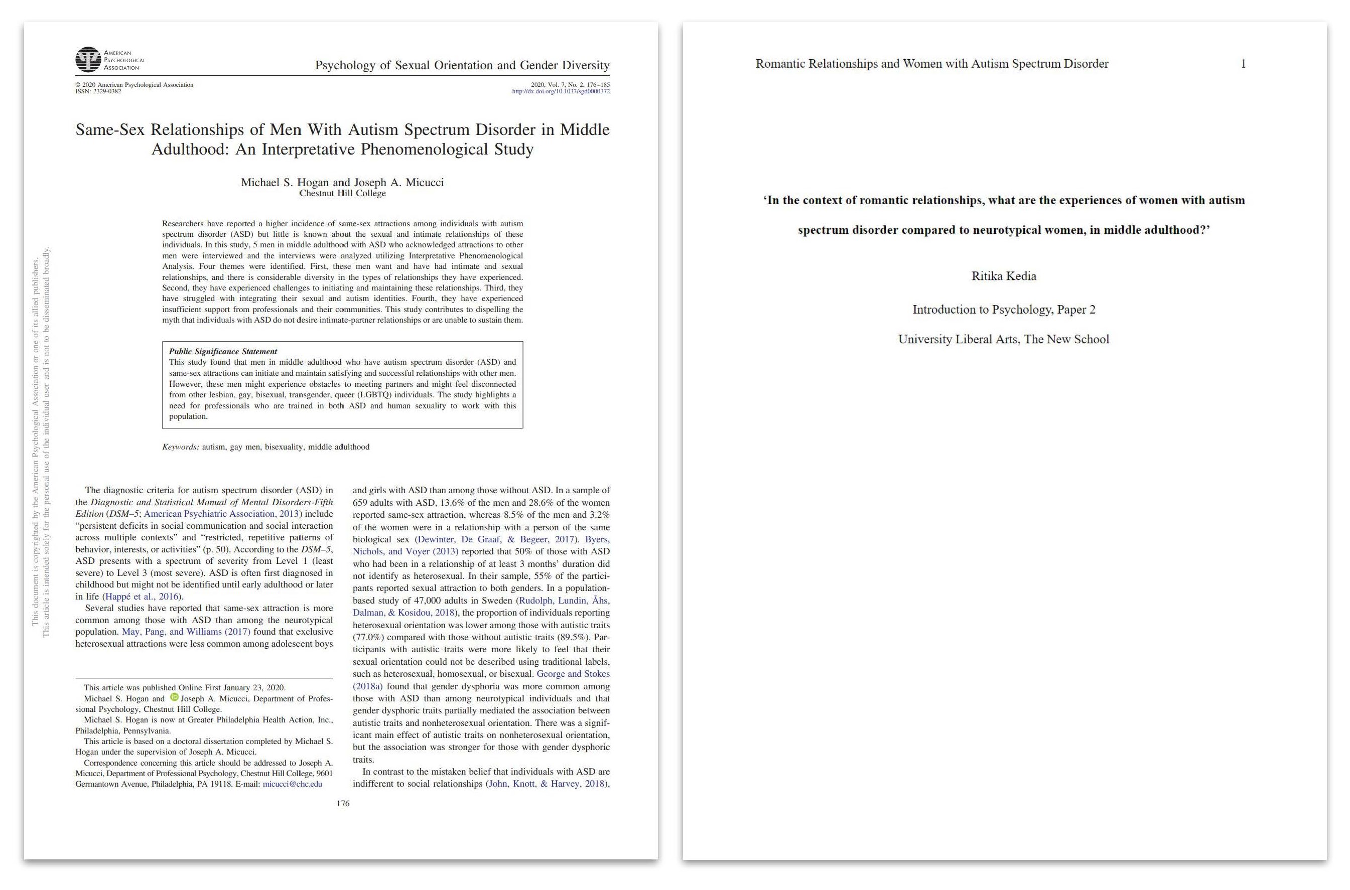 Hogan, M. S., & Micucci, J. A. (2020). Same-sex relationships of men with autism spectrum disorder in middle adulthood: An interpretative phenomenological study. Psychology of Sexual Orientation and Gender Diversity, 7(2), 176-185. http://dx.doi.org/10.1037/sgd0000372